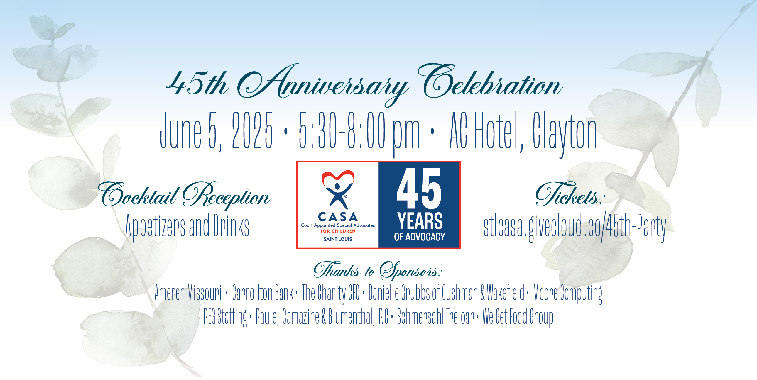 Please join us as we celebrate 45 years of CASA advocacy in St. Louis! We'll honor our past and share plans for our future with a cocktail party at the new AC Hotel in Clayton. Tickets and sponsorships are now available.